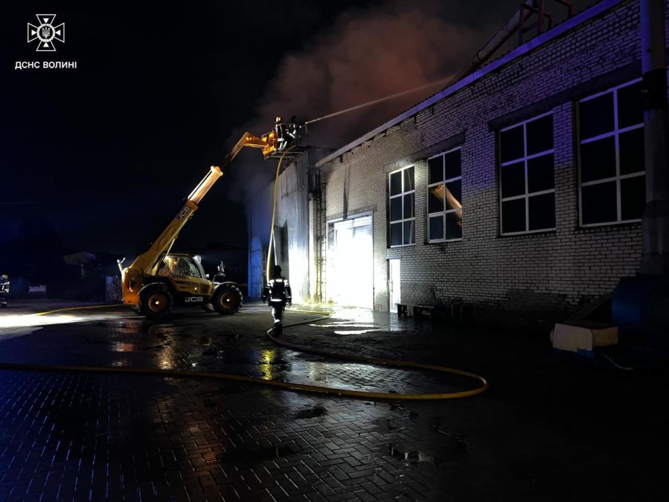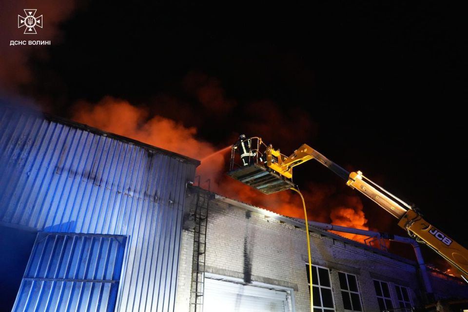 Под Луцком в посёлке Цумань после обстрела загорелось предприятие. Пожар площадью около 1000 кв. м тушили несколько часов, утром возгорание ликвидировано. Пострадавших нет, сообщили в ГосЧС.
