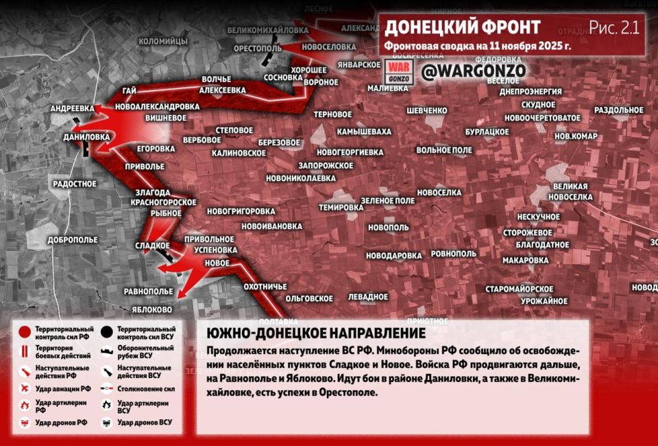 На Южно-Донецком направлении продолжается наступление ВС РФ. Минобороны РФ сообщило об освобождении населённых пунктов Сладкое и Новое. Войска РФ продвигаются дальше, на Равнополье и Яблоково. Идут бои в районе Даниловки, а также в Великомихайловке, есть успехи в Орестополе. (Рис. 2.1)