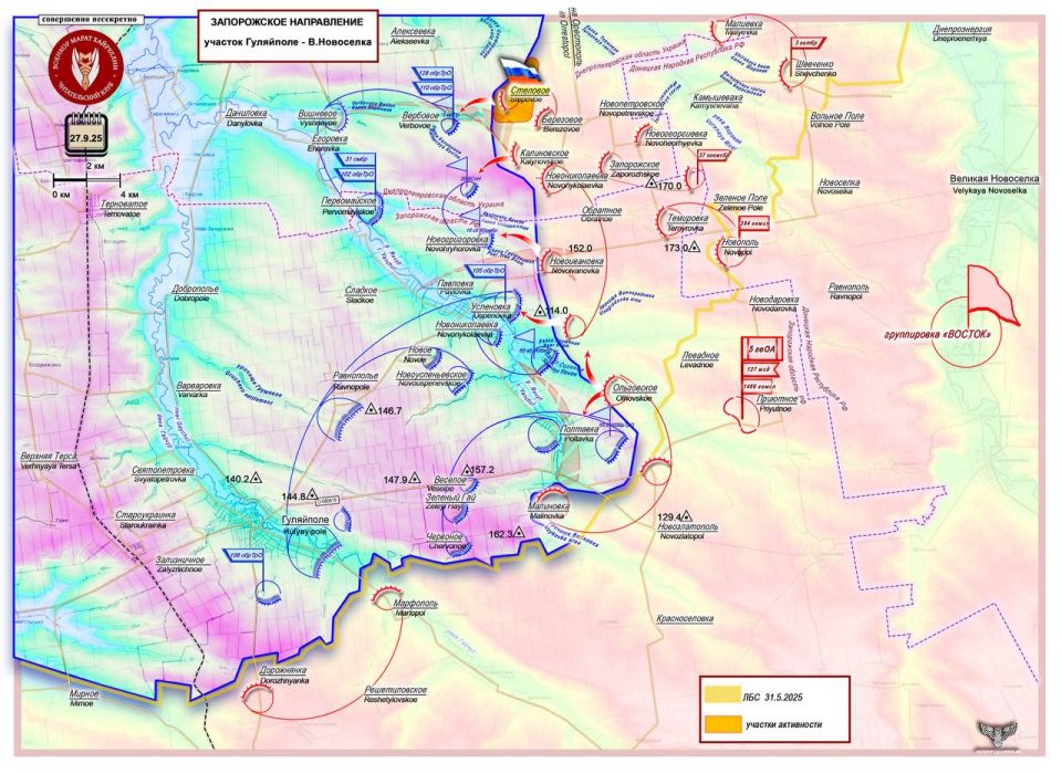 Освобожден н.п. Колодези и давлением на район Ставки нарушена логистика ВСУ. Активными действиями юго-восточнее у н.п. Кировск (Заречное) и Ямполь скованы для маневра вдоль ЛБС подразделения противника в районе Заречное - Шандриголово - Дробышево - Лиман.