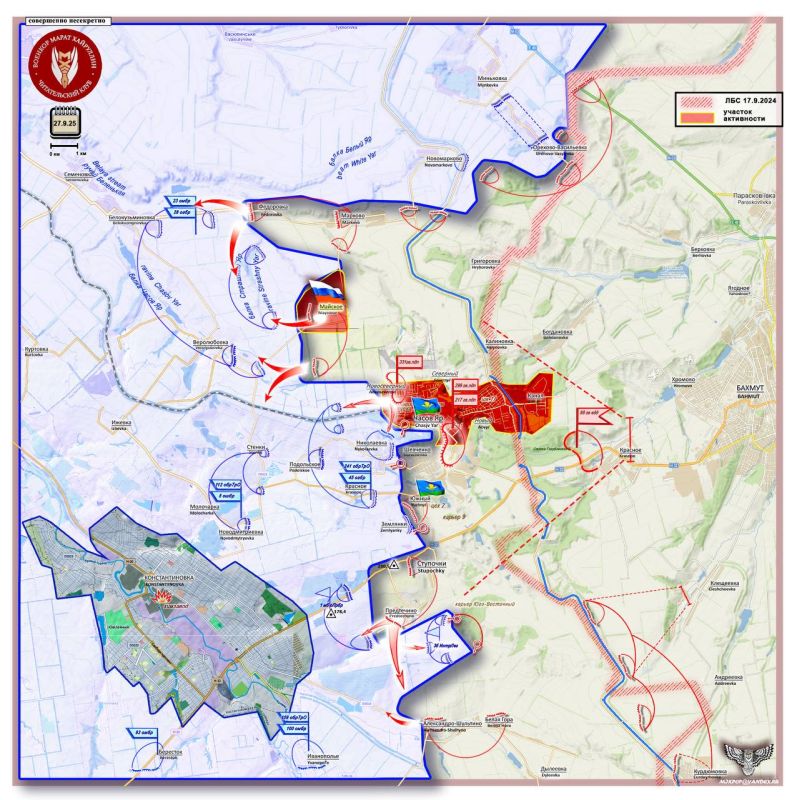 На северном участке Донецкого направления формируется глубокий охват г. Константиновка с севера. После освобождения н.п. Часов Яр ВС РФ настойчиво «вгрызаются» в узел обороны ВСУ Федоровка-Белокузьминовка-Веролюбовка, обеспечивающий сеть рокадных автодорог и железнодорожную ветку Краматорск-Часов Яр.