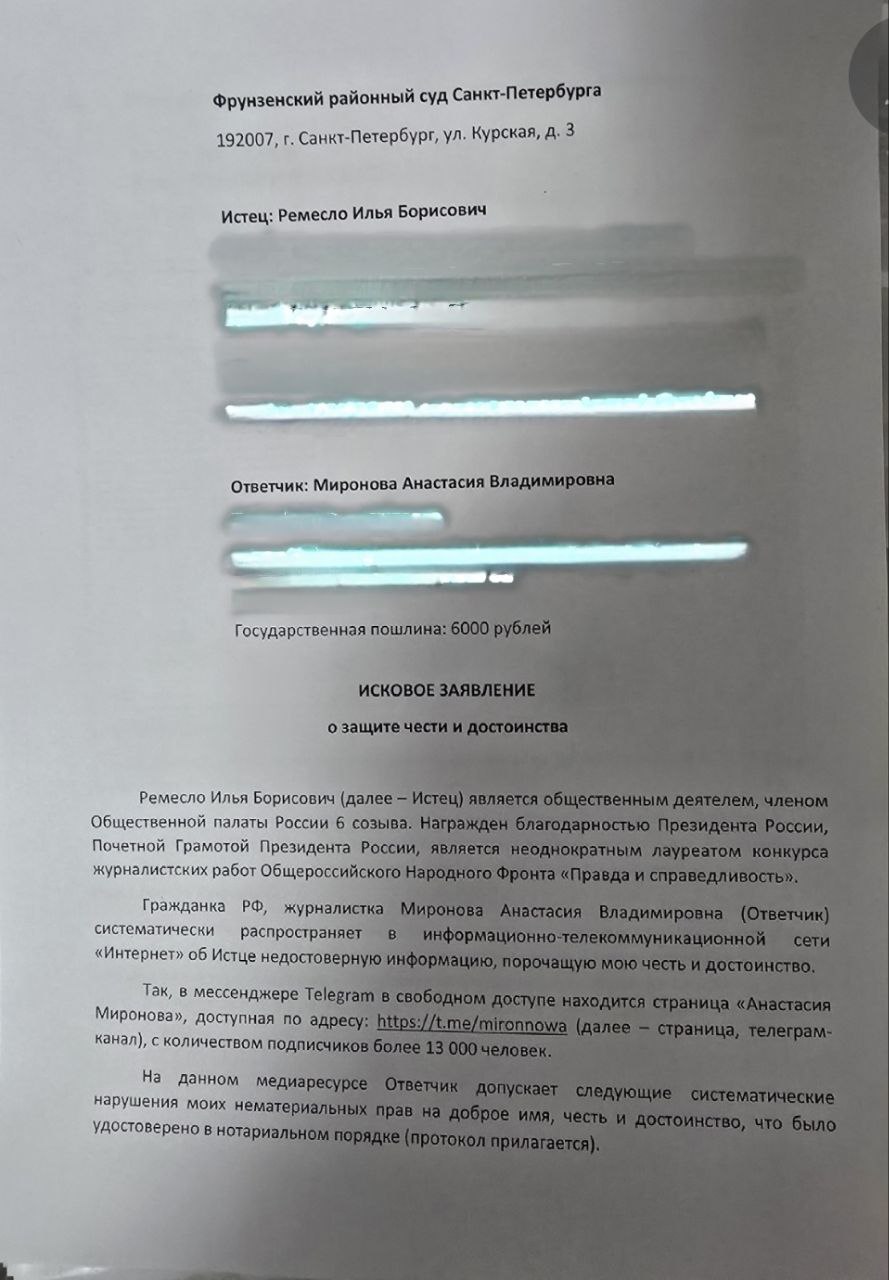 3. Иск юриста Ильи Ремесло (то есть мой) к отрицательно здоровой либероидке Анастасии Мироновой. Этот иск особенно интересен, а почему – узнаете чуть позже.