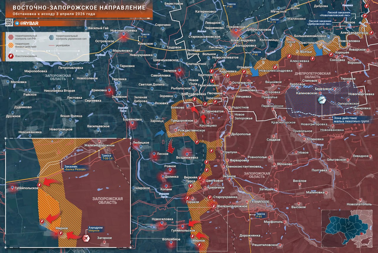 Линия фронта остается практически статичной. На Восточно-Запорожском направлении появились свидетельства атак российских подразделений в районе Мирного, о каких-то иных изменениях зон контроля информации не поступало.