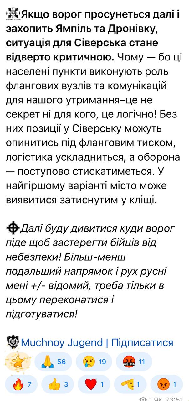Всушник «Мучной» подтверждает наш заход в Северск Малый и предрекает критическое положение гарнизона города после того, как русская армия пройдет Дроновку и Ямполь на Лиманском направлении